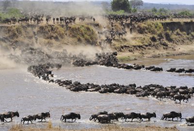 Wildebeest Migration (calving – Serengeti plains)Every year around 1.5 million wildebeests and hundreds of thousands of zebras cross the Serengeti plains on the search of fresh food and water, creating the largest terrestrial mammal migration. During this fight for survival, many wildebeest die, usually victims of the many predators that lie on the way and from exhaustion and starvation.